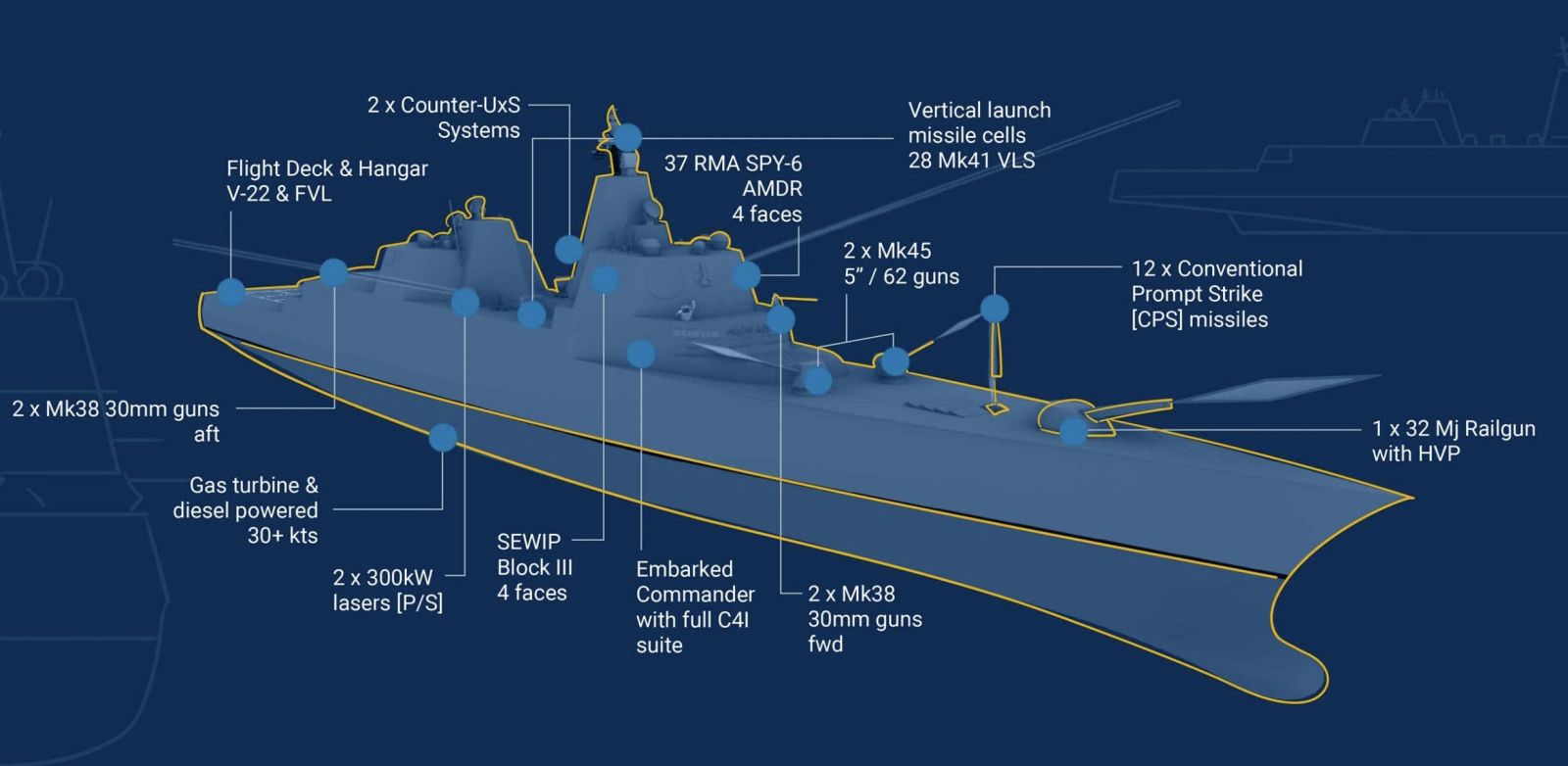 • Рейкотрон (railgun) та артилерія. У проєкті передбачається встановлення потужної артилерії, включно з рейкотроном 32-MJ LRG (електромагнітною гарматою) та двома традиційними скорострільними універсальними 127 мм гарматами для ураження морських, наземних та повітряних цілей.