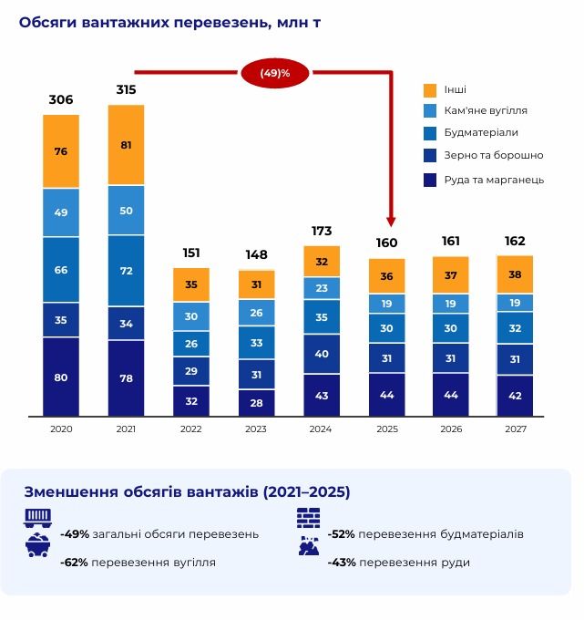 Графік показує падіння загальних обсягів на 49% (з 315 млн т у 2021 до 160 млн т у 2025). Найбільше скорочення (62%) зафіксовано для перевезення вугілля."