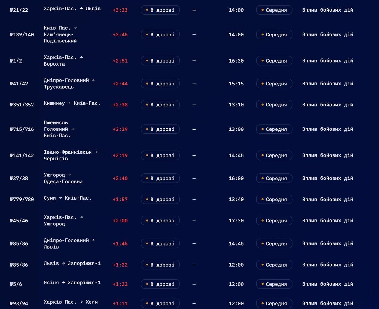 Станом на середину дня 1 квітня через триваючу російську повітряну атаку по центральним і західним регіонам України значно затримується велика кількість пасажирських поїздів.